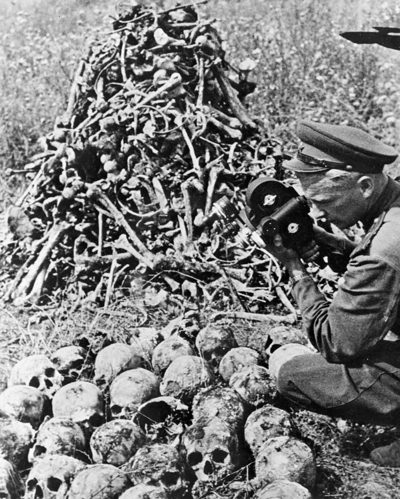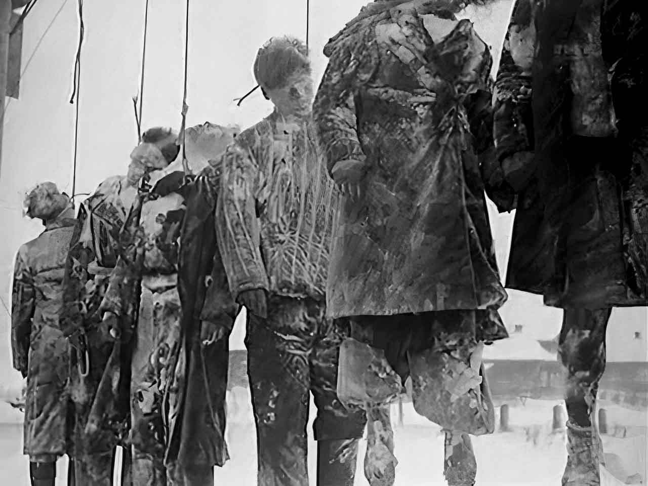 Есть и другая перекличка в фильмографии Кармена — не столь известная, но как минимум не менее важная для истории войны. В 1941-м в освобождённом Волоколамске Роман Кармен запечатлевает на камеру следы зверств нацистских оккупантов. Подмосковный город был освобождён 20 декабря 1941 года — и это одни из самых первых кинокадров с доказательствами преступлений нацизма, представленными международной публике…
