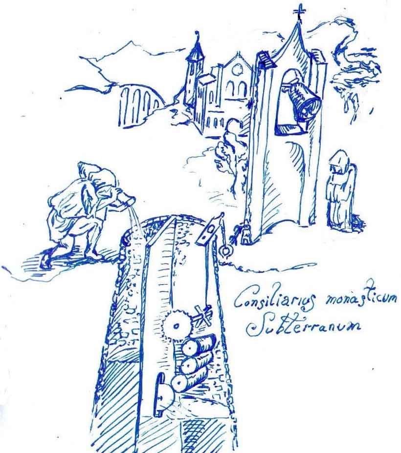 Брат Джеронимо изобрел способ, который, как ему казалось, навсегда избавит его собратьев от угрозы стать погорельцами. Для Consiliarius monasticum Subterranum нужен был только заброшенный колодец. В качестве жидкости, которой наполнялась бы половина его объема, францисканец предлагал использовать ту, что была принесена в дом, но так и не побывала в употреблении. Он заметил, что в монастырях ежедневно образовывается достаточное количество лишней абсолютно чистой воды, она остается в кадках и ведрах после стирки, купания, приготовления пищи и, как правило, выливается вместе с помоями. Применять жидкие отходы Джеронимо не рекомендовал. Жир из них будет пачкать механизм, со временем образуются засоры, которые его остановят.
