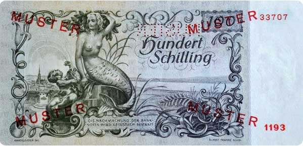 Но есть по меньшей мере одна реальная купюра, реверс которой посвящен почти исключительно образу русалки-ундины (как подобного рода мифологические существа именуются в германо-скандинавской мифологии). Это австрийская банкнота в 500 шиллингов 1949 года (дизайнер Эрхардт Амадеус Диер, гравер Руперт Франке).