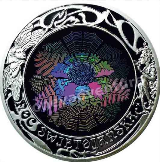 Конечно же, разработчики дизайна польской монеты не могли оставить столь важный чудотворный символ в языческих верованиях своих далеких предков без внимания. А посему изобразили цветок папоротника тут же, на оборотной стороне монеты. Причем сделано это было с использованием голографического изображения… Ну, а как иначе передать визуальное отличие волшебного растения от обычного?