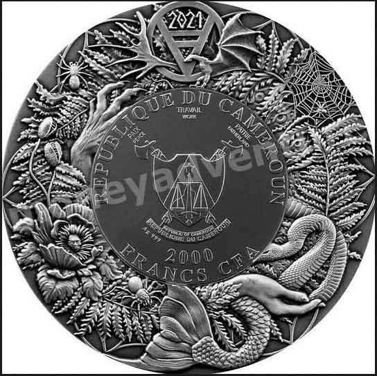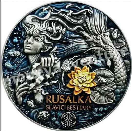 Как мы видим, на аверсе монеты нашлось место не только для листьев папоротника, но и для эльфов (выглядывающее из цветочного бутона личико в левой нижней части монетного поля). Там же изображен и русалочий хвост. А кроме того, кисти рук, которые, несмотря на явные различия, тоже могут принадлежать русалке. Ведь наши предки считали, что водная нечисть могла запросто видоизменяться. В результате чего, к примеру, русалка из красивой и привлекательной девушки быстро превращалась в страшную старуху. Кстати, об этом говорится и в кратком описании монетного сюжета на официальной интернет-страничке производителя: «В славянской мифологии русалки были демоническими существами, обитавшими в лесах, полях и водоемах. Их представляли как красивых обнаженных девушек с длинными распущенными волосами. Они громко смеялись и пели. Они появлялись во время новолуния и привлекали к себе молодых людей. Если кто-то приближался к ним, волосы русалок становились зелеными, а лица искажались. Русалки убивали приманенных людей, которые прикасались к ним. Считалось, что девы, умершие до свадьбы, становятся русалками».