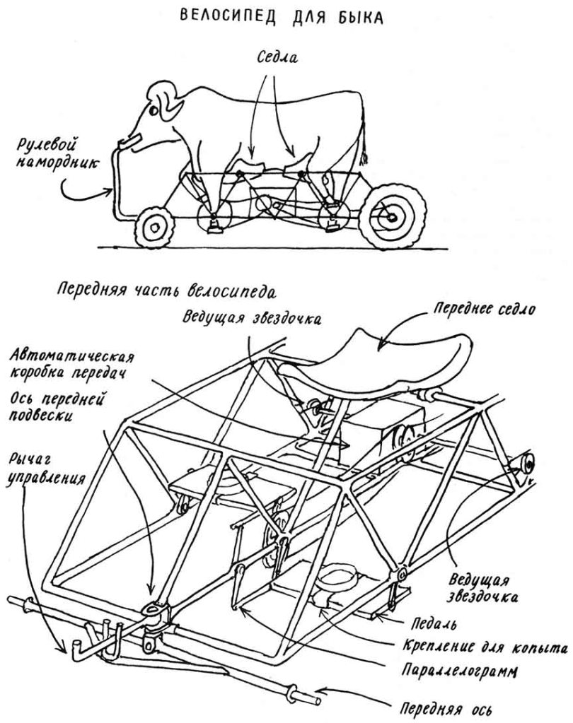 «Дедал считает велосипед великолепным изобретением, так как благодаря эффективному использованию мускульной тяги он увеличивает скорость передвижения человека по крайней мере в пять раз. Сделав велосипед для быка, мы во много раз увеличим полезную работу, совершаемую этим могучим, но медлительным животным. Четырехколесный опытный образец, сконструированный Дедалом, приводится в движение педалями через автоматическую коробку передач. Предполагается, что направлять движение такого транспорта будет человек. Однако Дедал хочет попробовать предоставить управление самому животному, чтобы посмотреть, как оно отнесется к новому для него способу передвижения».