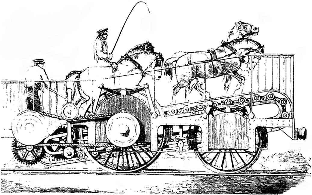 Да, сорок лет назад это еще (и уже) была шутка. Между тем XIX век, обеспокоенный развитием паровой энергетики никак не меньше, чем наша эпоха — глобальным потеплением, временами предлагал такие программы всерьез. Очень симптоматичен в этом смысле один проект «конелокомотива», который был выставлен на конкурс, организованный управлением железных дорог. Конечно, эта «антитехническая утопия» была отвергнута — однако, если абстрагироваться от авторского подхода (тогдашняя форма антиглобализма: «Все зло — от паровых двигателей, но нужно постараться, чтобы новомодное увлечение техническим прогрессом как можно скорее миновало и мир вернулся на круги своя!»), следует признать: сама конструкция остроумна, реально осуществима и в отдельных случаях, вероятно, даже выигрышна.