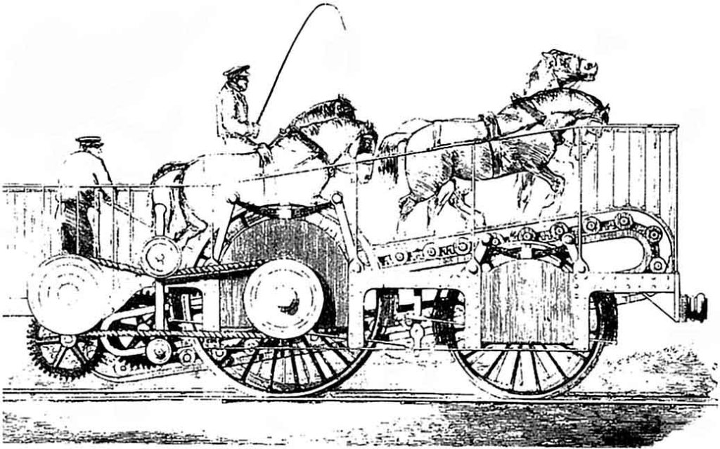Да, наша реальность задумалась об этих устройствах с запозданием, так что контекст их появления — или ретроградный, или шуточный. Но несбывшихся возможностей жаль. Ведь в условиях, где использование рельсового транспорта ограничено (а тот, что используется, зачастую — конка: «трамвай на конской тяге»), предмоторная эпоха затянулась очень надолго. И еще за несколько десятилетий до появления автомобиля цивилизация буквально задыхалась в тех достаточно узких рамках возможностей, которые ей порознь предоставляли паровые моторы — и традиционные упряжки. С огромными продольными габаритами и соответствующим радиусом поворота, относительно малоскоростные и неэкономичные… с «мотором», в стрессовых ситуациях склонным закусывать удила и поддаваться разрушительной панике, которую не остановить простым нажатием на тормоз…