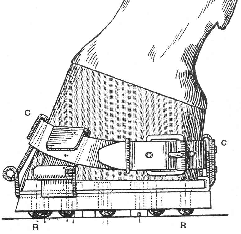 Иногда к странным результатам приводила не только гигантомания, как у Стокмана, но и миниатюризация (термина «нанотехнология» тоже еще не существовало, однако повышенная компактность начинала особо цениться). Сразу же после появления первых асфальтовых покрытий — основным «внерельсовым» средством передвижения продолжала оставаться конная упряжка — появились разработки… роликовых подков. Остается только надеяться, что этот накопытный аналог беговой дорожки все-таки был предложен в шутку: всерьез о нем мог задуматься только крайний лошадененавистник. Даже самый спокойный конь переломает себе ноги гораздо раньше, чем научится разъезжать на подобных роликах (если такое вообще возможно).