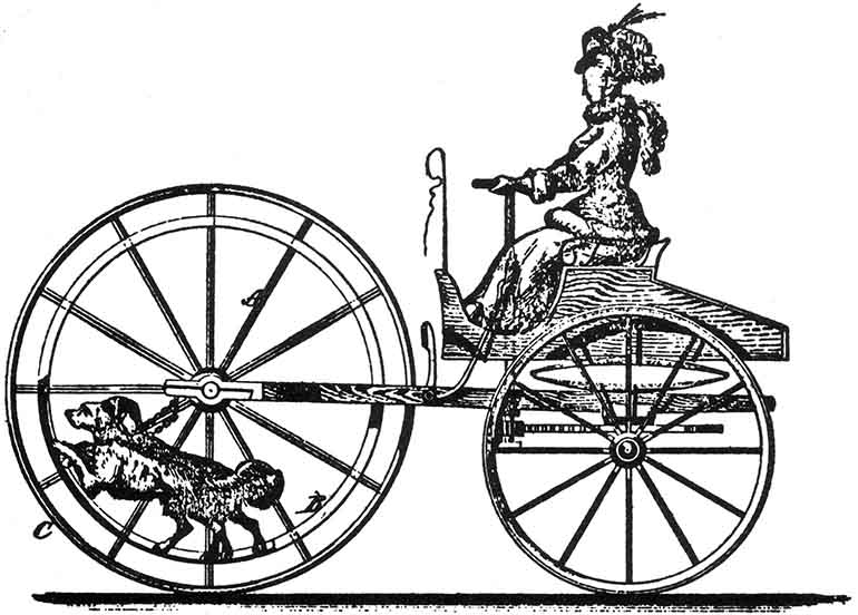 Существовали и экипажи, функционирующие по принципу «беличьего колеса»: не на лошадином ходу (колеса потребовались бы непомерно большие!), а на собачьем. Некоторые из них, при всей фантастичности, остаются в пределах реально осуществимого. При хорошей дороге и правильно продуманной запряжке может даже получиться вполне сносный КПД: куда больший, чем если использовать собак просто как тягловую силу (не обязательно в нартах: вплоть до 1920-х довольно привычно смотрелся крупный пес, впряженный в тележку мясника, молочника, старьевщика)…