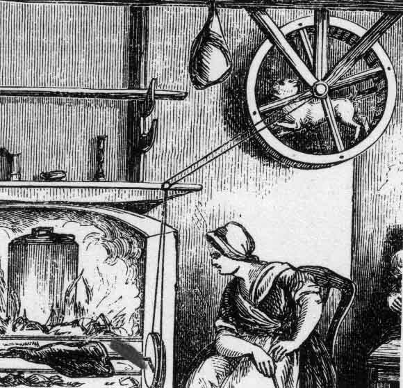 Пожалуй, эти изобретения творчески развивали традицию использования «очажных собак», они же «собаки для жаркого». Никакой корейской кулинарии: речь идет о вращении вертела, на котором в очаге жарится целая туша — когда барашек, а когда и бычок. В XVII—XIX веках это нередко делалось на собачьем приводе, причем механизм был самых разных типов, включая и колесо с бегающим внутри него псом. А псы для этого дела использовались и по-настоящему могучие — такие, что, отработав «наряд по кухне», потом несли караульную службу при военном лагере. В частности, первые упоминания о знаменитых собаках монастыря св. Бернара — именно такого типа: не горноспасательные, а «очажные» и одновременно охранные, сторожевые.