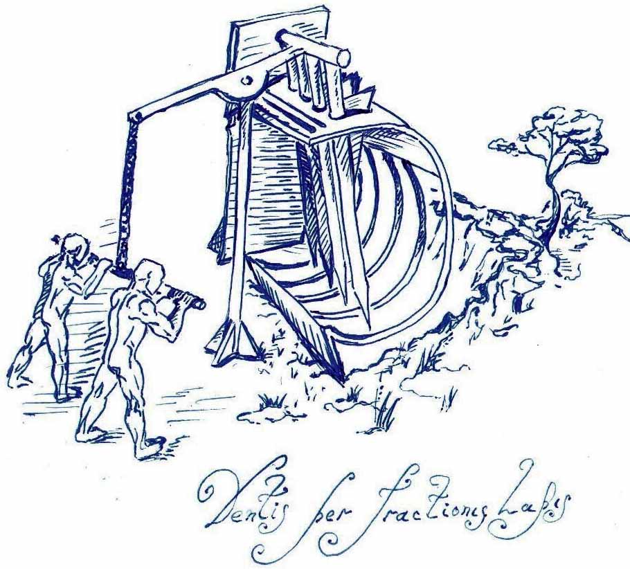Преимуществом механического гибрида кирки и лопаты являлось то, что габариты конструкции не были изначально заложены ее создателем. Брат Джеронимо понимал, что подобное устройство может быть использовано для самых разных работ. Будучи уверенным в том, что увеличение или уменьшение Dentis per fractionis lapis потребует только индивидуального расчета каждой детали, не сказавшись на рабочих характеристиках инструмента, он сделал соответствующую запись в своем альбоме. В поздних списках на рисунке начали появляться человеческие фигурки, позволявшие предположить масштаб конструкции. В данном случае мы наблюдаем весьма скромную фантазию, включающую только двоих тружеников.