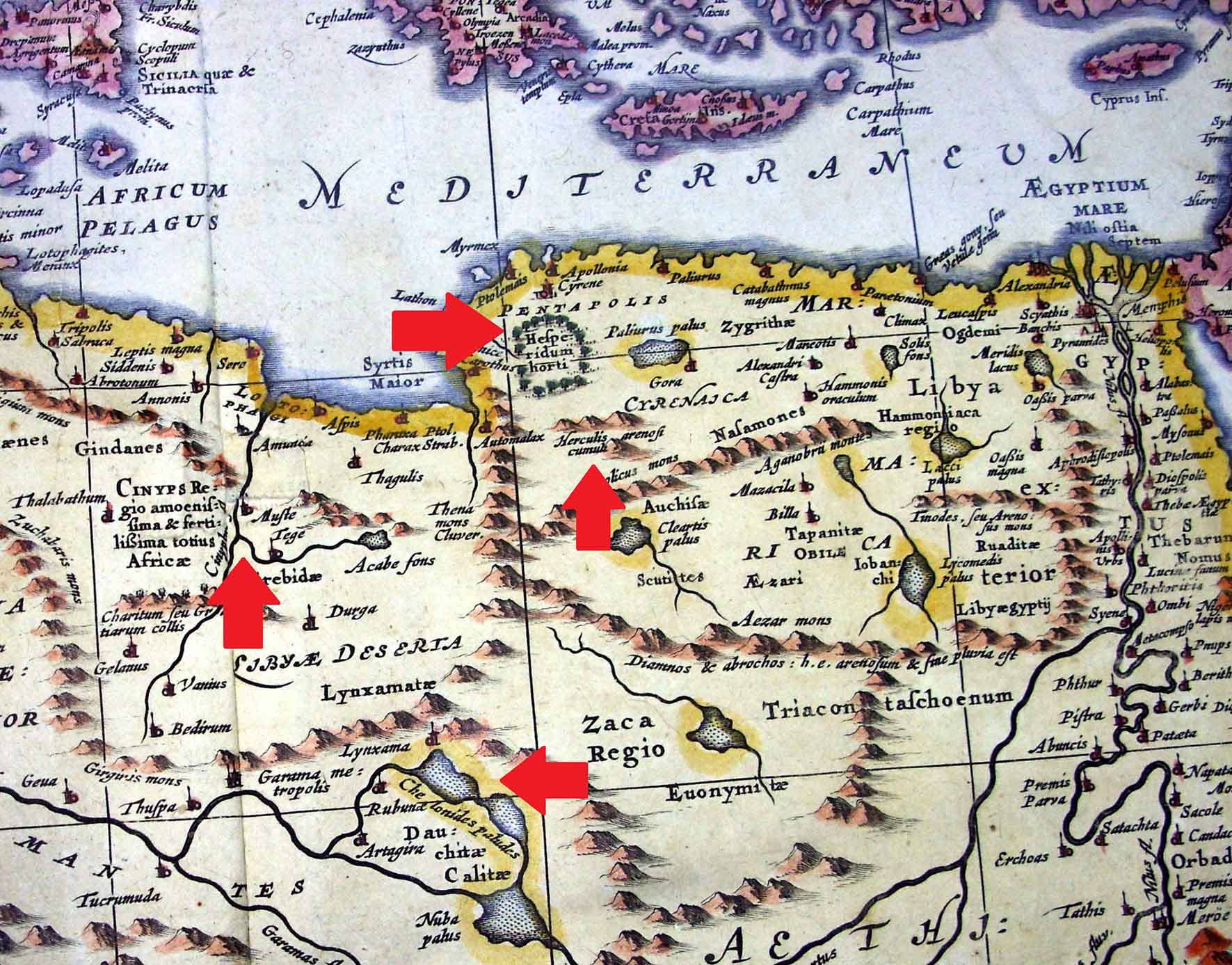 В исторической литературе принято полагать, что мифические Сады Гесперид с течением времени помещались сказителями все дальше и дальше на таинственный запад, по мере удаления горизонта известного мира греков. Потому локализацию Садов прямо у западной границы Египта следует рассматривать как наиболее раннюю. Судя по обилию топонимов, связанных с Гесперидами и Геркулесом, в древней Киренаике, где когда-то была плодородная земля на берегах доисторической реки Сахаби, формировалось ядро мифов о Гесперидах-Атлантидах. Соответственно, в Ливии могли быть и другие атланты.