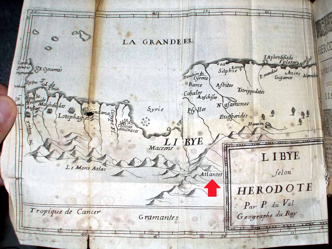 Интересно, что еще в 1660 году Пьер Дюваль, «географ короля» Людовика XIV, опубликовал географическую карту «Ливия по Геродоту», где поместил горы Атлас южнее Сиртов, а атлантов поселил у гор южнее Большого Сирта. Единственными горами там является нагорье Тибести.