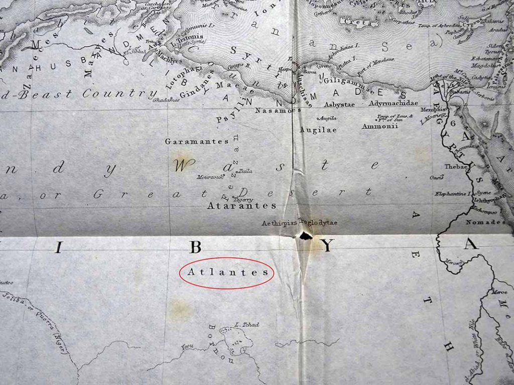 Геродот прямо упоминает атлантов в своем описании Ливии: «Еще дальше, в десяти днях пути от гарамантов, находится другой соляной холм с источником. Около него также живет племя под названием атаранты… Далее еще через десять дней пути [приходим] опять к соляному холму с источником, вокруг которого также обитают люди. К этому-то соляному холму примыкает гора под названием Атлас. Гора эта узкая, и круглая, и, как говорят, так высока, что вершин ее не видно. Зимой и летом она постоянно покрыта облаками. Местные жители называют ее столпом неба, и от имени этой-то горы они и получили свое название. И действительно, их зовут атлантами» (Геродот. История, кн. 3 «Мельпомена», 184). Эдвард Банбери, автор «Истории древней географии» (т. 1, Лондон, 1879), дал интересный комментарий этой цитаты: «Следует заметить, что это имя [атаранты] было переделано во всех существующих рукописях Геродота на атланты» (с. 279). Упоминание же атарантов было «восстановлено» в XIX веке на основании текстов не самого Геродота, а по указанию его средневековых комментаторов. По мнению Э. Банбери: «Оба имени, по всей вероятности, являются только формами одного и того же».