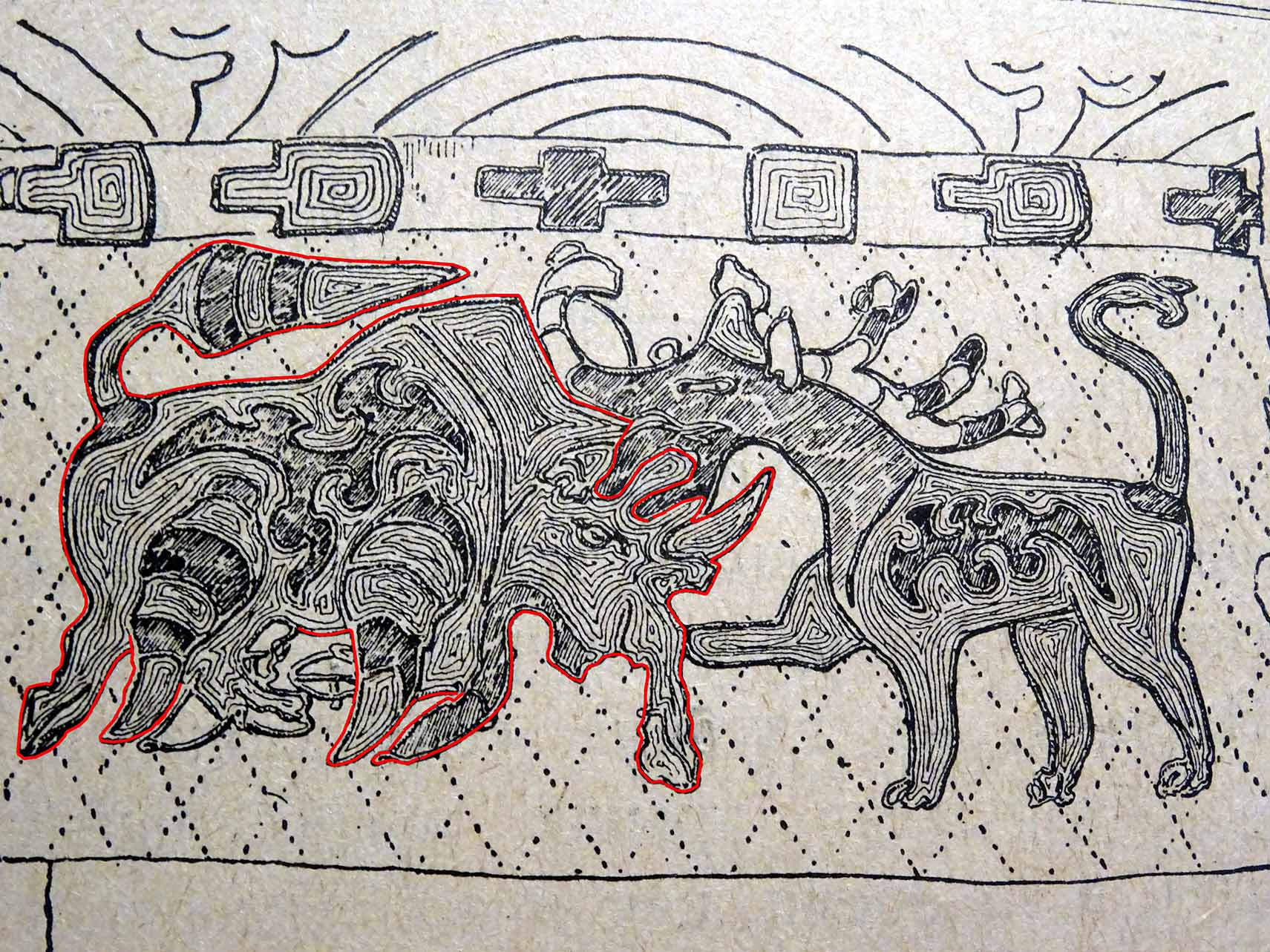 Еще одно стилизованное изображение носорога мне удалось разглядеть на ковре народа Хун-Ну, вытканном предками знаменитых гуннов в Монголии на рубеже новой эры (см. рис. 3 из: Козлов П. К. Наша научная экспедиция в сердце Азии // Вестник знания, 1925, № 9, с. 610—618).