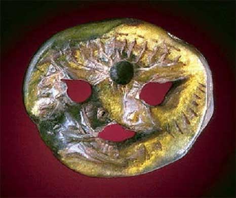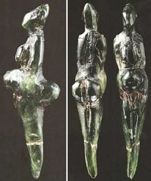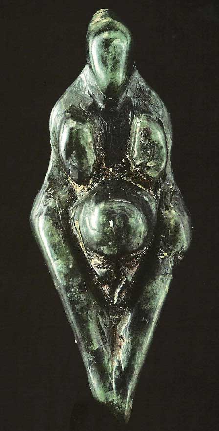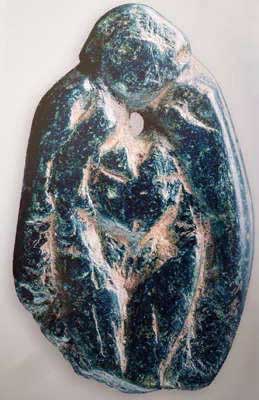 Она же Янус. Лицо изображено на обеих сторонах приплюснутой фигурки. Высота 62 мм. Сделана из тёмно-зелёного стеатита.