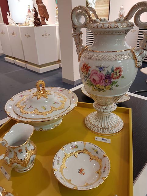 В начале XVIII века немецкий алхимик Иоганн Бёттгер изобрёл необыкновенный фарфор. Он по качеству не уступал китайскому, отличался крепостью и чистотой звона. Тогда курфюрст Август Сильный в 1710 году открыл фарфоровую фабрику, и теперь Европа не зависела от дорогого фарфора Китая. И по сей день фарфор Мeйсена таит в себе необыкновенную тайну и притягательность. Мы замирали перед витринами с мeйсенскими розами, тончайшим кружевом, росписями с изображением бытовых сцен и с пейзажами. Коллекция статуэток на мифологические темы когда-то была выполнена по заказу российской императрицы Екатерины Великой. И всё-таки мы не удержались, купили по паре чашек с блюдцами, приобщились, так сказать. Мeйсенский фарфор до сих пор пишется вручную. Рецепты красок, которыми расписывают эти изделия, и сегодня хранят в строжайшем секрете. Однако мы подглядывали, как наносится роспись — нелёгкое это дело!