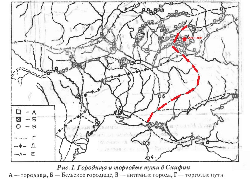 Еще при скифах действовал торгово-военный путь, известный в XVI—XVII веках как «Муравский шлях». Путь этот проходил по водоразделу Днепр — Дон от Крыма к скоплению городищ на Харьковщине (рис. 1; Шрамко 1999). Видимо, в последнюю четверть VI века до н. э. это был торговый путь, снабжавший Харьковщину товарами с морских побережий. Ведь именно в это время праславянские поселения максимально концентрируются около Муравского шляха (Гречко 2010, с. ). Однако уже на рубеже VI—V вв. до н. э. праславяне пытались блокировать этот «шлях» для пришельцев из южных степей. Поперек дороги был возведен оборонительный вал с прилегающим рвом южнее его длиною 5,8 км у села Перекоп Валковского района Харьковской области (Крютченко 2017).