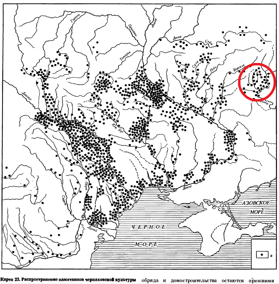 Была нужда и в командно-административном центре. Кандидат на такой центр виден на рис. 6 в виде компактного скопления находок черняховских артефактов у слияния рек Харьков и Лопань (отмечено красным кольцом), как раз там, где находится исторический центр Харькова. Однако наиболее ранние черняховские артефакты (фибулы 250—310 годов) были обнаружены в нескольких километрах севернее (Любичев 2019, ч. 2, с. 212). Поэтому основание черняховского поселения именно в историческом центре Харькова следует отнести ориентировочно к первой половине IV века. А начало колонизации территории современного Харькова черняховцами датируется серединой III века (230—270 гг.; Любичев 2019, ч. 1, с. 28).