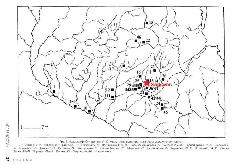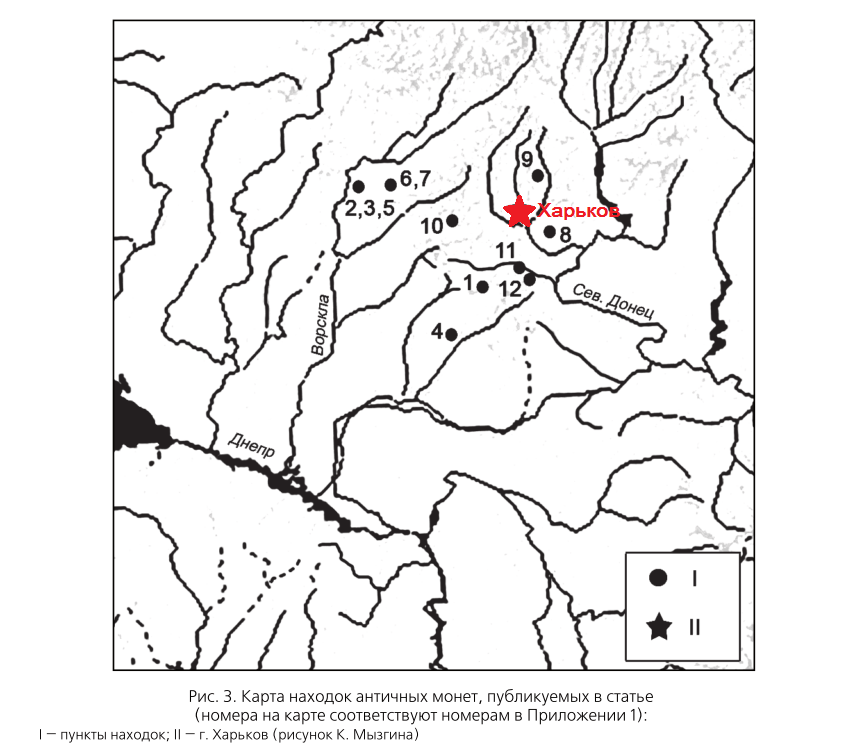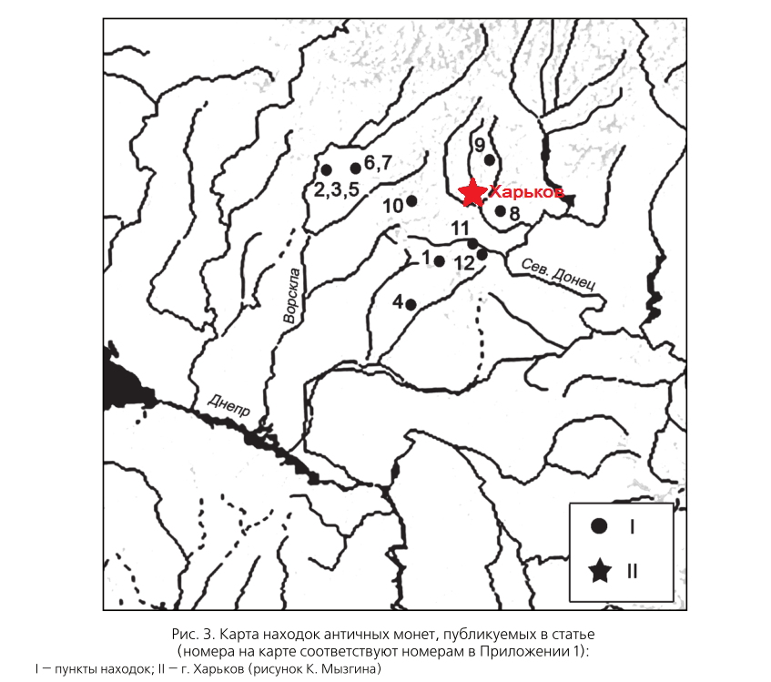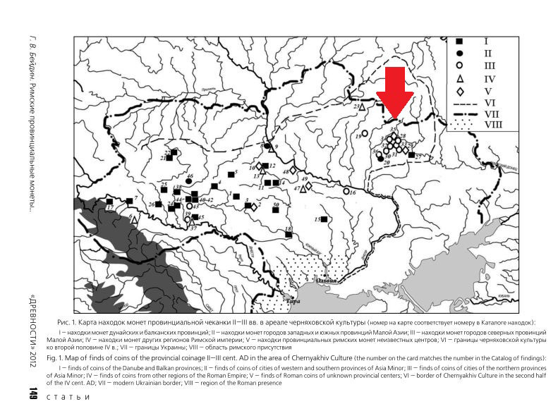 Четкую концентрацию артефактов на Харьковщине показывает карта распределения археологических памятников черняховской культуры II—IV веков н.э. (рис. 2; Рыбаков 1993, с. 126). Примечательно, что на Восточной Украине находки образуют четкое скопление в районе Харькова. Аналогично на Харьковщине концентрируются находки древнеримских монет II—III веков (рис. 3, Бейдин 2012), III—IV веков (рис. 4; Мызгин 2015), а также фибулы — металлические застежки для одежды III—V веков (рис. 5; Любичев 2008).