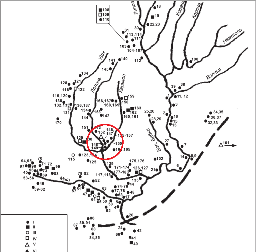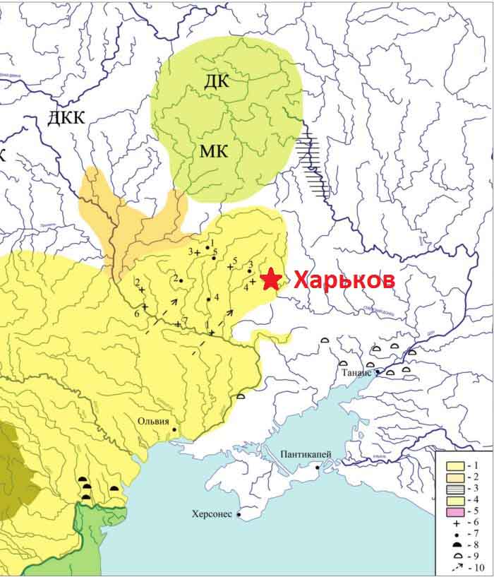 Хотя среди археологов распространено мнение о том, что столица тогда располагалась «на Бельском городище — центре торговой и экономической жизни до III в. до н. э. на Левобережье» (Бейдин и Григорьянц 2010, с. 160), Бельское поселение на реке Ворскла в Полтавской области не имеет такого обилия городищ по соседству, какое мы видим в харьковском кластере на рис. 1. Концентрация около Харькова мест находок коротких скифских кинжалов VI века до н. э. (Бабенко 2009) подтверждает важный социальный статус этой территории. Однако, несмотря на обилие древних поселений вдоль рек Харьков и Лопань, в самом удобном месте у слияния этих рек, где находится исторический центр Харькова, археологическая карта показывает лишь белое пятно (Гречко 2010, с. 149). По-видимому, этот парадоксальный факт отражает не отсутствие поселения здесь, а, вероятнее, отсутствие достаточно глубоких раскопок вообще в густо застроенном центре мегаполиса.