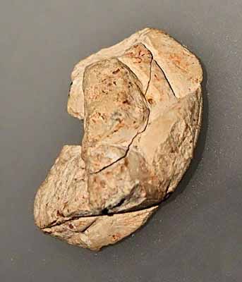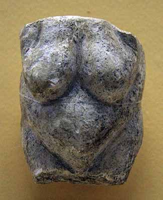 Фрагмент фигурки венеры. Этот артефакт из известняка представляет собой часть женской статуэтки, просверленной на уровне груди. Левая рука всё ещё видна. Отверстие, вероятно, служило для подвешивания предмета на шнуре.