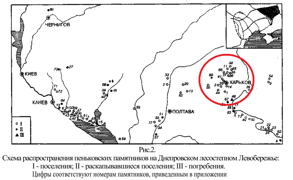 Пока гунны вместе с частью остготов испытывали на прочность Римскую империю, с Днепра на Харьковщину прибыли славянские племена антов, носителей пеньковской культуры. В пеньковское время (V—VII века) Харьковщина сохраняет статус ведущего региона на территории Восточной Украины, как о том свидетельствует концентрация пеньковских артефактов вокруг Харькова (рис. 8). Следовательно, на Харьковщине было некое социальное образование, способное противостоять нашествию очередных степняков. В 555—562 годах кочевники авары переселились из казахстанских степей на Дунай, где создали Аварский каганат. Харьковщина была на их пути, но уцелела.