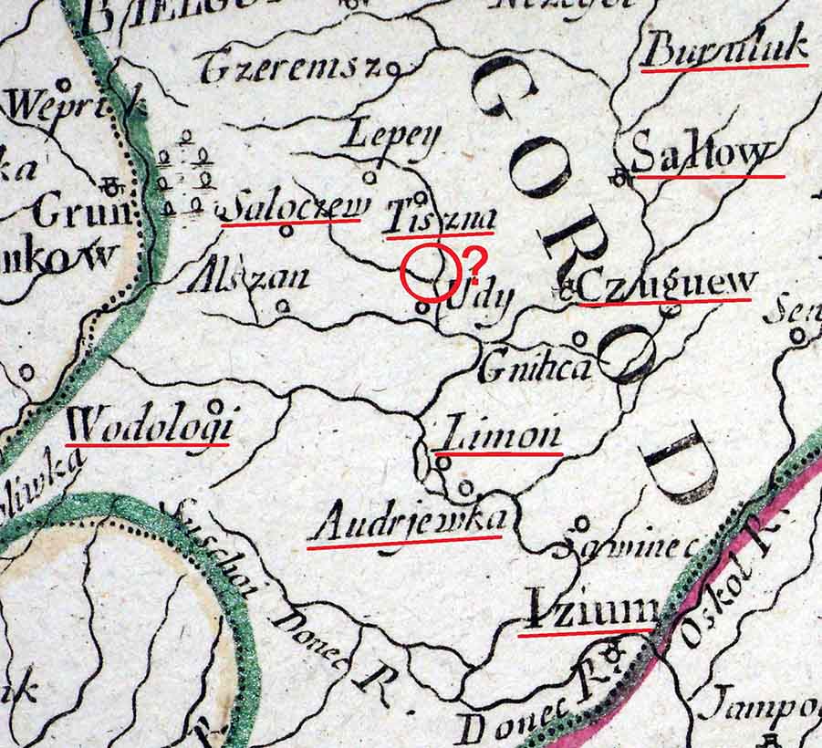 Неожиданным реликтом Дикого поля является отсутствие Харькова на географических картах некоторых европейских мастеров XVIII века. Примером такого рода является венецианская карта «Европейская Россия» Франческо Сантини (Santini 1776) из собрания автора (рис. 9). Здесь показаны такие соседи Харькова по области, как Андреевка (Andrjewka), Великий Бурлук (Buruluk), Водолага (Wodologi), Изюм (Izium), Золочев (Saloczew), Лиман (Limon), Салтов (Saltow), Тишки (Tiszna), Чугуев (Czuguew). Правильно показано слияние рек Уды и Лопань, но вот вместо Харькова там пустое место…