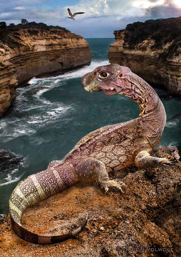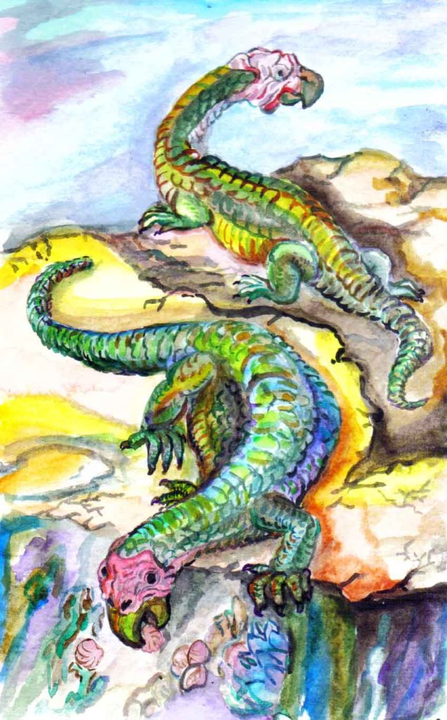 Удивительно, но первое описание этой рептилии можно найти в перечне диковинных птиц Африки. Путешественник XV века пишет, что на побережье он наблюдал колонию удивительных созданий, способных сбрасывать оперение ради продолжения рода. Чтобы защитить яйца и беспомощных в первые дни жизни птенцов от хищников, они обустраивают гнезда у самой кромки воды. Перед тем, как приступить к строительству, птицы объедаются рыбой, выбирая особей с укрытым плотной чешуей телом. Накопив достаточно питательных веществ, свойственных жителям вод, будущие родители начинают выщипывать из себя перья, на месте которых тотчас вырастает чешуя. Отныне им не страшны лучи палящего солнца и брызги соленой воды. Пара выкапывает яму, куда самка откладывает яйца. Согревать кладку и заботится о птенцах они будут по очереди. Весь этот период несчастные довольствуются скудной пищей, выбрасываемой на камни волнами. Благо, что детский возраст у представителей этого странного вида длится не более недели. За это время птенчики покрываются перьями. Как только малыши готовы взлететь, чешуя взрослых трескается, высвобождая традиционный для птиц наряд, и семейство взмывает в воздух. Далее следует описание магических свойств яиц, которые могут созревать как в течение нескольких суток, так и годами. Последние, утратившие мать и отца, погибших от голода, применяются африканскими колдунами для проведения магических обрядов.