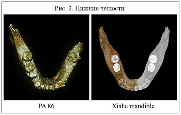 Поздние азиатские эректусы прогрессировали. Например, размер мозга поздних синантропов был больше, чем у ранних, что, видимо, и привело к появлению азиатского варианта Homo heidelbergensis. В пользу этой версии говорит отсутствие третьего моляра (как основного маркера денисовского человека) на челюсти ланьтяньского человека PA 86 и на челюсти денисовского человека Xiahe mandible (рис. 2). По другой версии, появление азиатского варианта Homo heidelbergensis можно связать с миграцией в Азию Homo bodoensis1, который имеет схожую морфологию черепа.