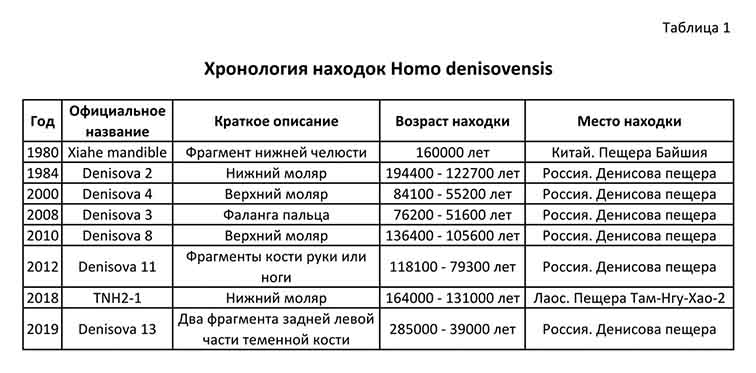 Находки, сделанные в Денисовой пещере, расположенной на территории Солонешенского района Алтайского края России, позволили открыть неизвестный ранее вид Homo denisovensis. Как известно, это первый и пока единственный вид Homo, открытый по ДНК. На сегодняшний день в мире обнаружены несколько фрагментов костей, относящихся к этому виду (табл. 1).