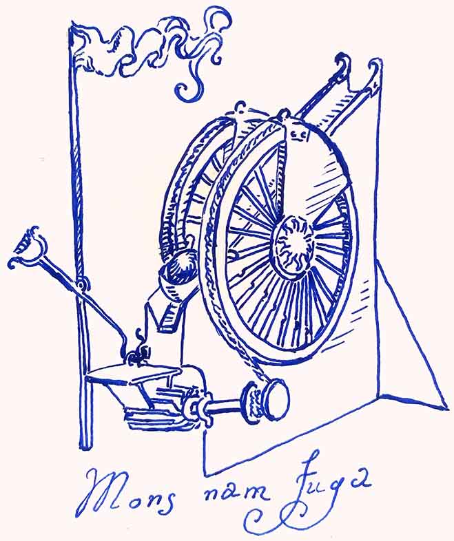Народная молва добавляет к приведенному наименованию механизма слово «diabelis». Эта конструкция является одним из доказательств того, что брат Джеронимо в своих изысканиях удалился от Христа и погубил собственную душу. Минорит не снабдил эту работу внятным описанием ее применения, оставив потомкам возможность самостоятельно придумывать, что именно можно запускать в воздух при помощи двух вращающихся колес. Находились смелые умы, бравшие Mons nam fuga на вооружение, но фантазия большинства людей прошлого порождала сказания о монахе, связавшемся с Сатаной. Зловещий рисунок приводится в большинстве списков рукописи францисканца, привлекая внимание мистиков. Чтобы претензий к его содержанию не было, традиционно изображается версия 1510 года, когда для обороны замка Эстенсе от французов из останков пушечного лафета соорудили машину, способную бросать ядра в лагерь противника. Насколько эффективно было орудие, неизвестно, однако можно однозначно утверждать, что францисканец не является его автором. Следуя человеколюбивым заветам Христа, он посвящал свои труды исключительно миролюбивым занятиям.