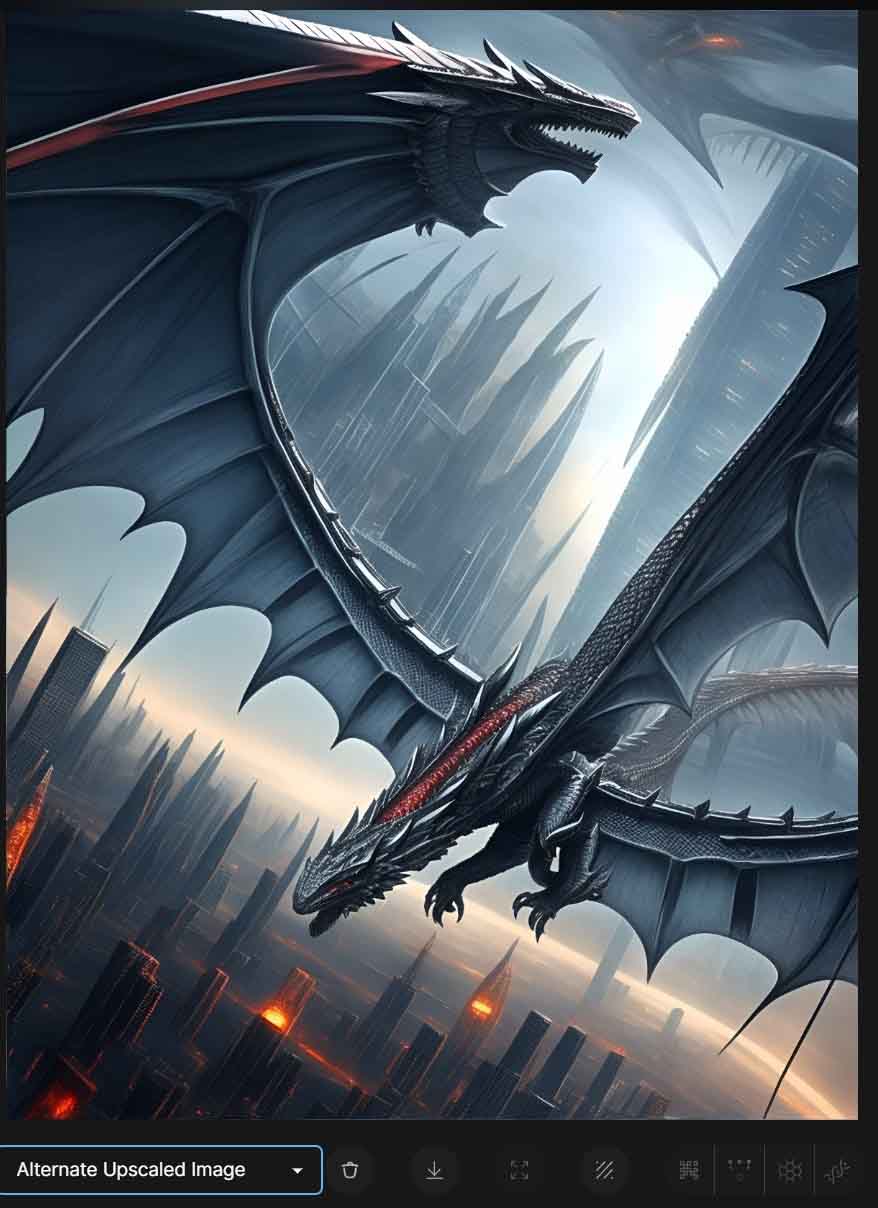 Уже неплохо, но качество текстур, третье крыло из спины, нога из попы и лишняя пасть не позволяют признать результат успешным. Давайте для начала улучшим качество при помощи рендера. Жмём на одну из иконок в левом нижнем углу, я выбрал «Upscale Image Alternate». Всего рендера четыре, с разными свойствами, а ещё можно стереть фон или отдалить изображение.