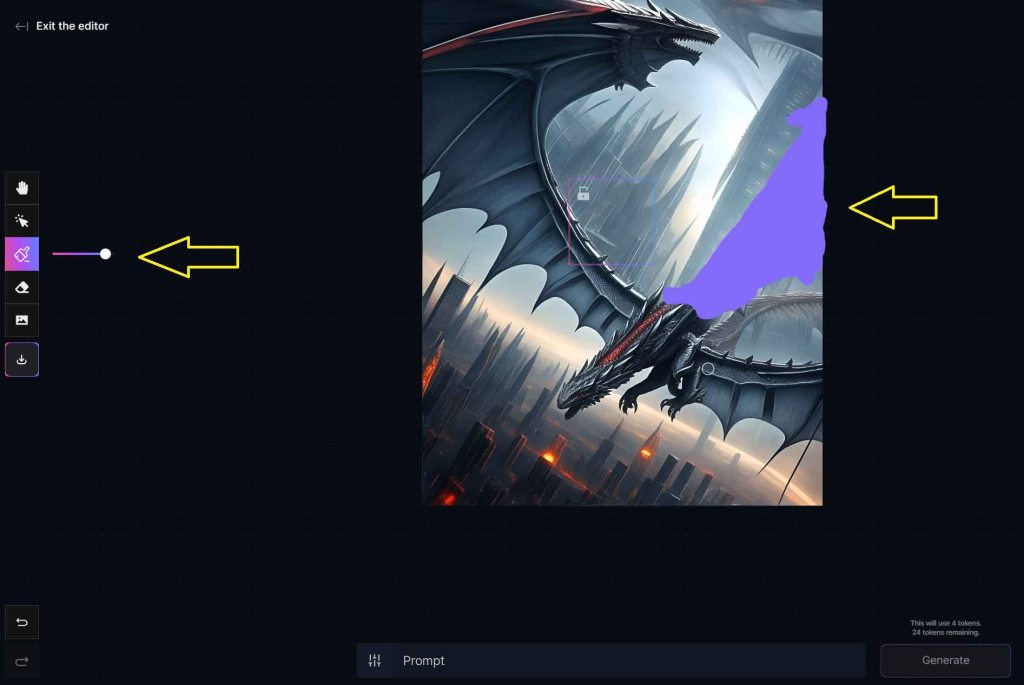 Крыло исчезло, но дракон получился какой-то надкусанный. По той же схеме закрашиваем область спины, только в «prompt» пишем: «спина дракона, кожа дракона, хребет, высокое качество, чешуя».