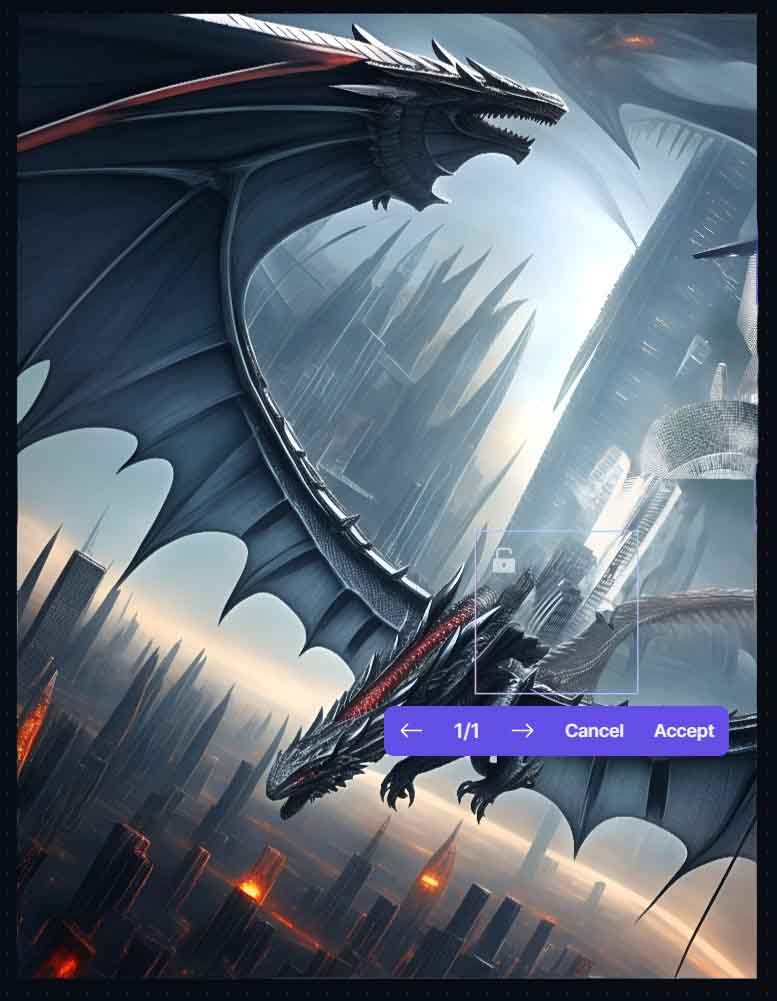 Время заняться пятой ногой, выделяем, вводим: «задний фон, небо», генерируем. Дополнительно обрабатываем место у второй лапы со словами: «крыло дракона, кожа, чешуя».