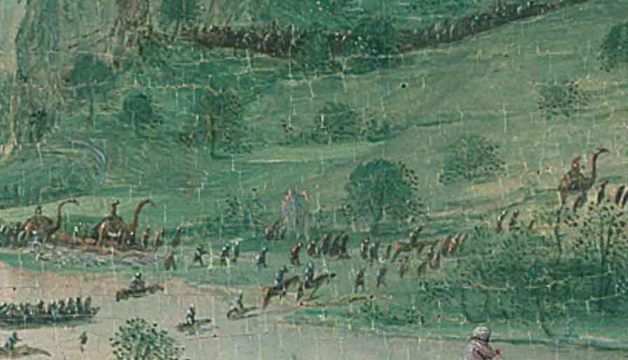 Скажем, что если эти существа не похожи на верблюдов ни с первого взгляда, ни со второго, то все-таки похожи с третьего — а этого для средневекового художника и зрителей его картин (которые, как и сам Брейгель, о верблюдах слышали, но не видели их ни вживую, ни на реалистических зарисовках) вполне достаточно. Если присмотреться, существа эти не такие уж гигантские: соотношение с ростом всадника, сидящего на спине у каждого из них, примерно такое же, как то должно быть в верблюжьей «кавалерии». Да, шеи у них длинноваты и тонковаты, а головы маловаты — но это с запасом можно списать на искажения, возникающие при изображении по описаниям или со стилизованных рисунков. Отсутствие ушей объясняется тем, что уж больно мелкий план использован: ведь и у лошадей (а в колонне отступающего войска мы видим и нескольких вполне «традиционных» всадников, причем они расположены даже ближе) ушей тоже не различить…