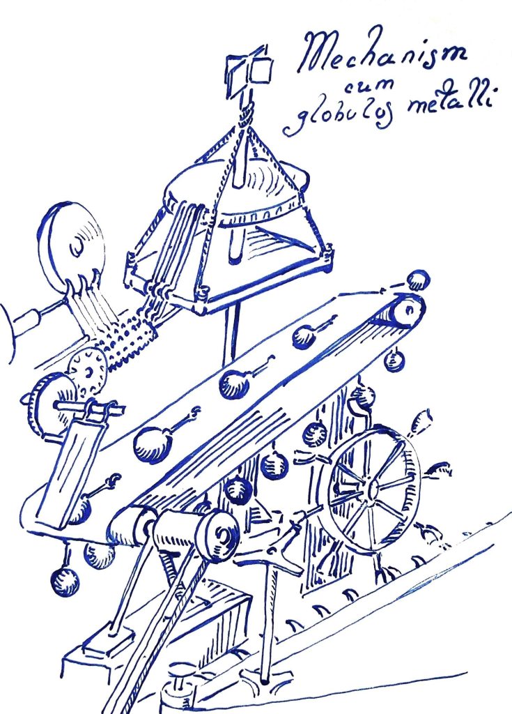 Среди наследия брата Джеронимо можно найти ряд хронометров, предназначенных для самых разных нужд монастырской братии, и, как правило, известны их заказчик, место и время воплощения замысла. В случае с Mechanism cum globulos metalli такой информации нет. Возможно, мы имеем дело с далеко не первой попыткой францисканца изобрести Perpetuum mobile. Судя по всему, работа была завершена, но дошло до нас изображение ее отдельных элементов.
