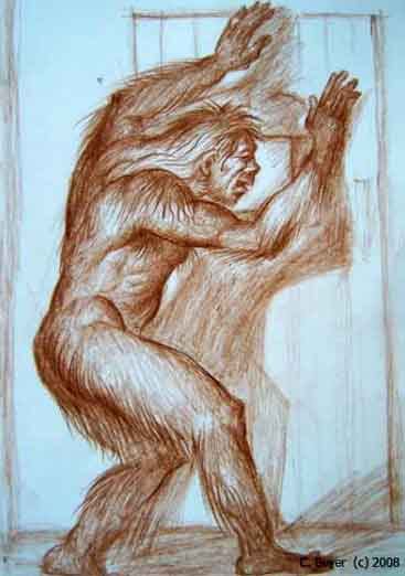«Первый раз я видел алмасты в сентябре 1944 года. В то время у нас в республике были отряды добровольцев (дружинников) по поддержанию порядка, борьбе с бандитизмом и т. д. Я был членом такого отряда. Отряд был сборный — были в нем и карачаевцы, и осетины, и наших кабардинцев собрали с разных мест. Однажды мы ехали верхом по конопляному полю, около Черной речки. Я ехал вторым, а первым — человек из Аргудана, он умер теперь. Вдруг его лошадь так резко остановилась, что я чуть не наехал на него. Он говорит мне: „Смотри, алмасты!“ Впереди, в нескольких метрах, стояла губганана (одно из местных названий алмасты-женщины) и забрасывала себе в рот верхушки конопляных стержней с семенами. Сзади столпился весь отряд, зашумел, и она, увидев нас, очень быстро побежала на двух ногах в кош, который стоял недалеко. Несколько человек сорвали с плеч ружья и хотели стрелять. Но наш командир — русский офицер из Нальчика — закричал: „Не стреляйте, не стреляйте! Давайте лучше возьмем ее живой и доставим в Нальчик“. Мы спешились и окружили кош. Нас было много, и мы смогли полностью замкнуть круг вокруг коша. Я оказался как раз напротив двери коша и все видел очень хорошо. Пока мы приближались, губганана два или три раза выскакивала из коша. Она казалась очень взволнованной: выскакивает, суетится, бросается в одну сторону, а там люди, вбежит обратно в кош, тут же снова выскакивает, бросается в другую сторону, но там тоже люди. При этом она гримасничала, губы быстро-быстро шевелились и бубнили что-то. Между тем наша цепь все больше приближалась к кошу. Мы сомкнулись и шли уже локоть к локтю. В это время губганана выскочила еще раз, заметалась да вдруг закричала очень страшным криком и кинулась прямо на людей. Бежит она быстрее лошади. По правде сказать, люди растерялись. Она легко прорвала нашу цепь, с разбега прыгнула в овраг и скрылась в зарослях, окружающих речку. Ростом она была 1 м 80 см, здоровая. Лицо плохо видно из-за волос. Груди до низа живота. Вся покрыта длинными рыжими волосами, напоминающими волос буйвола. Следы же — я ходил их смотреть в овраге — небольшие. Я очень удивился тогда несоответствию между ее ростом и следами ног».