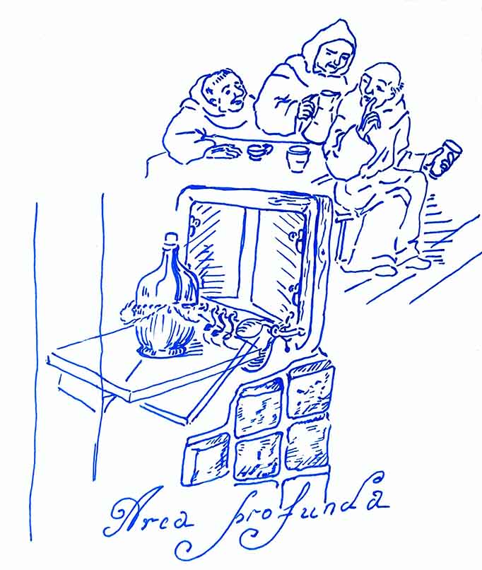 Наверное, самой смешной историей, в которой фигурирует Arca profunda, является повествование о том, как настоятель аббатства сан-Лоренцо в Триенте изгонял дьявола. Случилось это в те печальные времена, когда город охватил страх перед чернокнижниками. Святой отец, будучи горьким пьяницей, не боялся Сатаны, но опасался за свою репутацию. Монах, состоявший при нем прислужником, однажды допив из чаши господина, пожелал ежедневно угощаться хмельным напитком. Обладая субтильным телосложением, этот хитрец забирался в шкаф, которым был оборудован кабинет аббата, ловко извлекал бутыль и наслаждался ее содержимым.