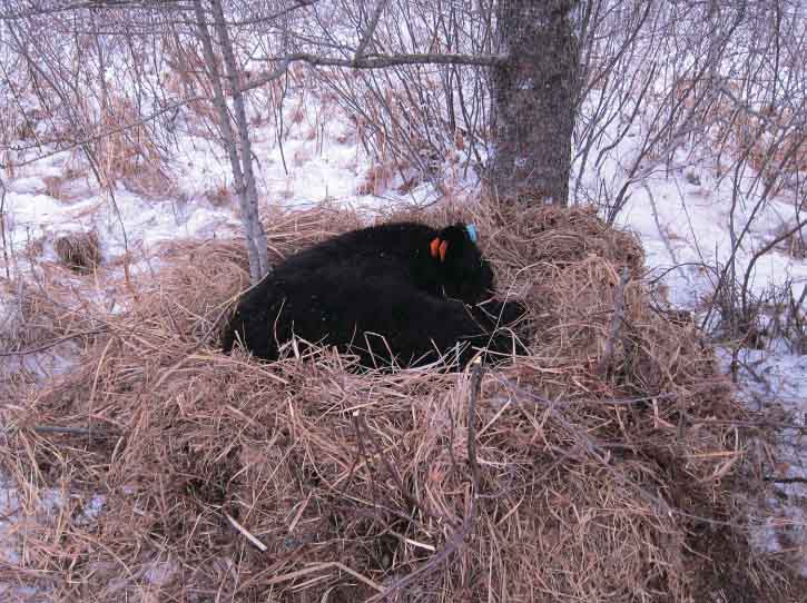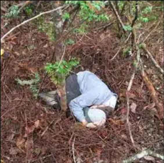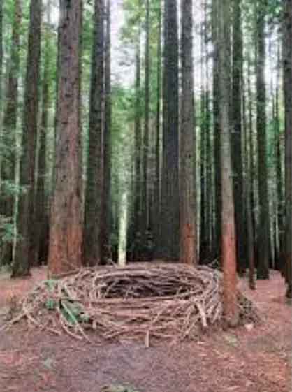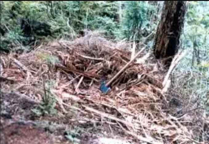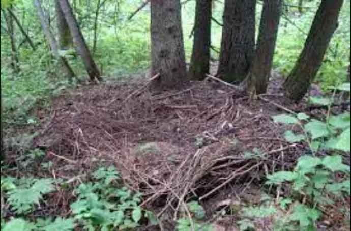 «По доходившим до нас слухам, мы знали об огромных гнездах, сплетенных из ветвей и считавшихся местами временного обитания дикого человека, а некоторые из них нам даже довелось видеть. Спустя много лет в совсем других лесах, в Карачае, на северном склоне Кавказа, мне довелось исследовать похожее гнездо, найденное опытными местными охотниками. Оно было овальной формы (1,20 м х 1 м); располагавшаяся по внешнему краю ветка диаметром 5 см была не полностью сломана, но подвергнута скручиванию на 360° вокруг своих волокон (причем это движение можно было осуществить только одной рукой), а затем отогнута в левую сторону. В 80 см левее места излома первой ветки была сломана другая, идентичная, тоже скручена на 360° и переплетена с первой — подобно рукам, скрещенным на груди. По остальному периметру располагались одинаковые, менее мощные ветки. Ветви поменьше были сдвинуты к центру, образуя толстый гамак, просторную мягкую подстилку. Мне удалось там комфортно расположиться».