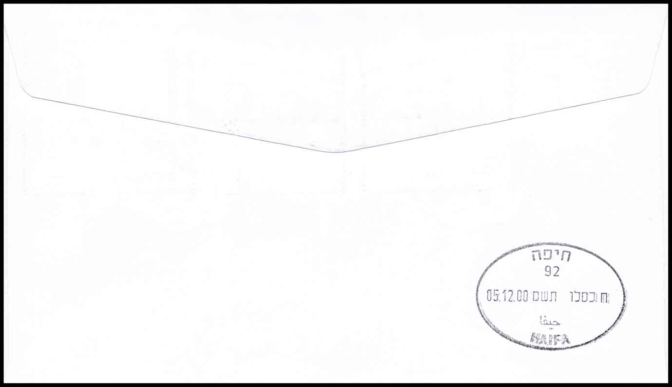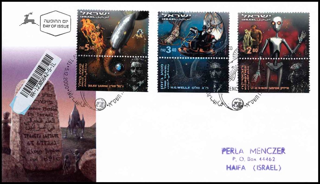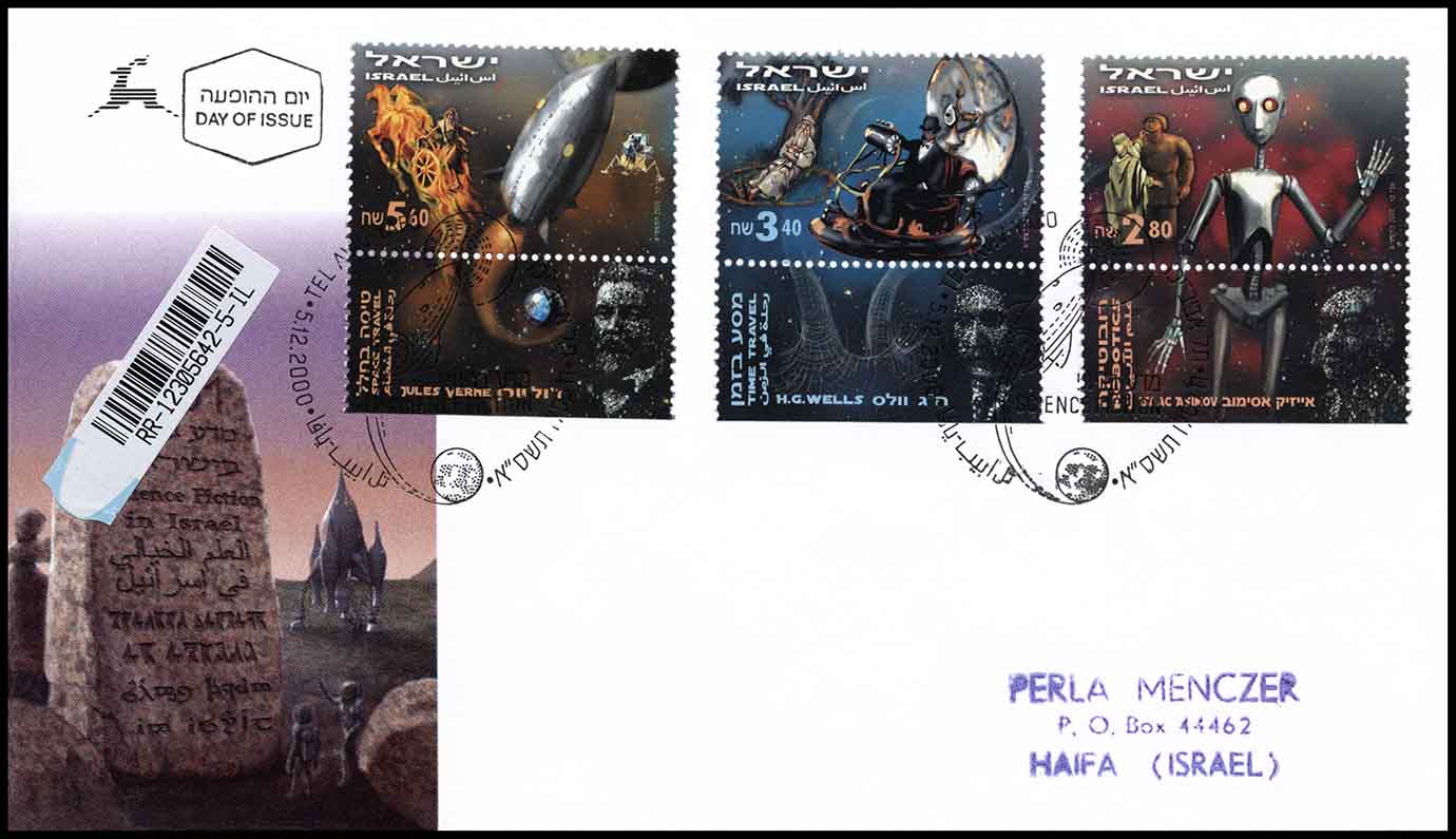 Вместе с марками выпущен красочный конверт первого дня. На его рисунке изображена Изреельская долина около Мегиддо, место последней битвы добра со злом в конце света. Зелёные инопланетяне в скафандрах, вышедшие из странного вида космического корабля, разглядывают древний монолит с высеченным числом «2001» вверху и надписями «Научная фантастика в Израиле» на пяти языках: иврите, английском, арабском, клингонском (язык клингонов из «Звёздного пути») и тенгваре (письменность в мире Средиземья Дж. Р. Р. Толкина). Для гашения применялся специальный штемпель с рисунком снаряда Жюля Верна, летящего с Земли к Луне.