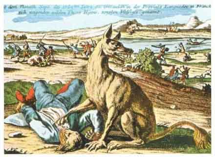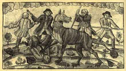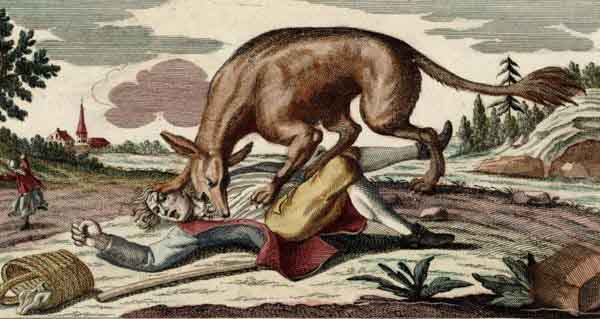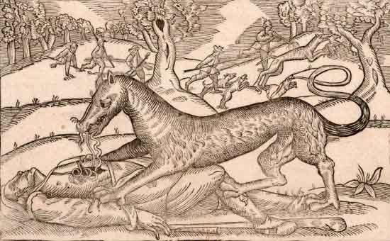 «Жеводанский Зверь» (bête du Gévaudan) оставил наиболее глубокий след в истории. В 1764—1767 годах приблизительно в 500 км южнее Парижа было совершено свыше 210 нападений, в результате которых 113 человек погибли и 49 получили ранения; 98 убитых были частично съедены15. Обычно этого хищника принято считать волком или помесью волка и собаки. Однако некоторые сохранившиеся гравюры позволяют вспомнить волко-оленя c оленьими чертами (длинная шея, вытянутая морда и большие уши), но с зубами и повадками хищника (рис. 8—10).