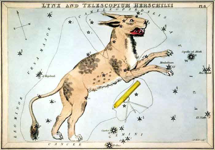 Гевелий разъяснял: «Рысь, которую я поместил между Большой Медведицей и Возничим над Близнецами, где на глобусах находится пустое место, которое обычно заполнено посвящениями и надписями. Там я обнаружил 19 звезд, правда, не с помощью какого-либо телескопа, а невооруженным глазом… Но если кто-нибудь захочет их точно и правильно созерцать, рассматривать и классифицировать, то пусть он прежде всего не будет близорук, а навострит свое зрение, чтобы он мог хорошо различать вещи издалека… Тот, кто хочет созерцать Рысь, должен быть рысью»1.