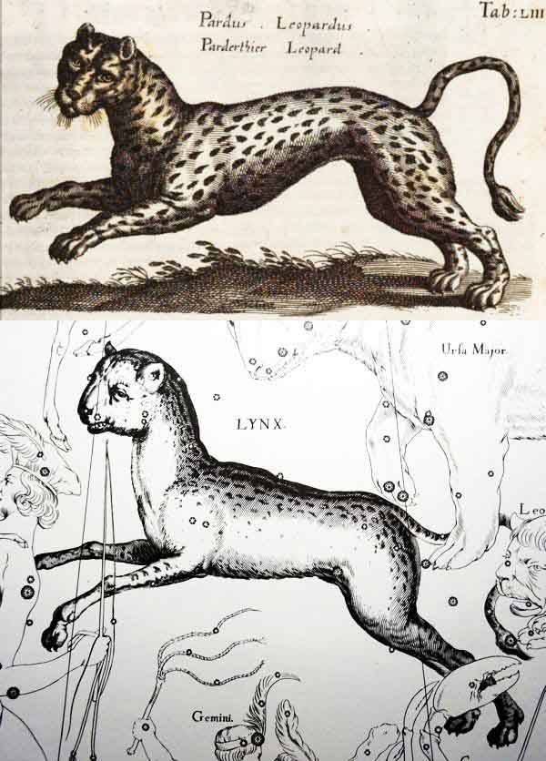 Рисунок 4 показывает несомненное сходство изображения «Рыси» из атласа Гевелия с более ранним изображением леопарда из книги Джонстона. Расположение лап зверей, изгиб длинного хвоста с кисточкой на конце, длинная шея, полуоборот морды и небольшие уши без кисточек рыси настолько похожи, что не оставляют сомнений — созвездие срисовано с леопарда Джонстона. Причем во втором издании упомянутой книги (Амстердам 1657) изображение леопарда дано в зеркальном отражении, что не соответствует изображению у Гевелия. В той же книге Джонстона9 нашелся и Малый Лев (Leo Minor на табл. 52), помещенный Гевелием на небо рядом с созвездием Рысь.