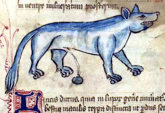 Следовательно, не исключена путаница собственно рысей с неким другим животным. В качестве иллюстрации этой возможности можно привести странное изображение «рыси», обнаруженное в «Бестиарии Энн Уолш» первой четверти XV века (рис. 5). Там хорошо заметен явно не рысий и не волчий длинный хвост с кисточкой на конце, как на звездных картах (рис. 1 и 2), а также сильно вытянутая голова зверя.