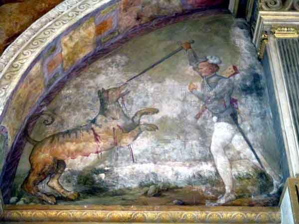 Агрессивность якобы рыси была отмечена еще в 1548 г., когда Себастьян де Рабутен, судебный пристав при дворе французского короля Генриха II, в сотне километров южнее центра Парижа, в Орлеанском лесу подвергся нападению «рыси» (loup-cervier, то есть волка-оленя) с длинным тонким хвостом и вытянутой мордой. Происшествию было придано такое значение, что король повелел увековечить это событие на фреске в бальной зале замка Фонтенбло (рис. 6).
