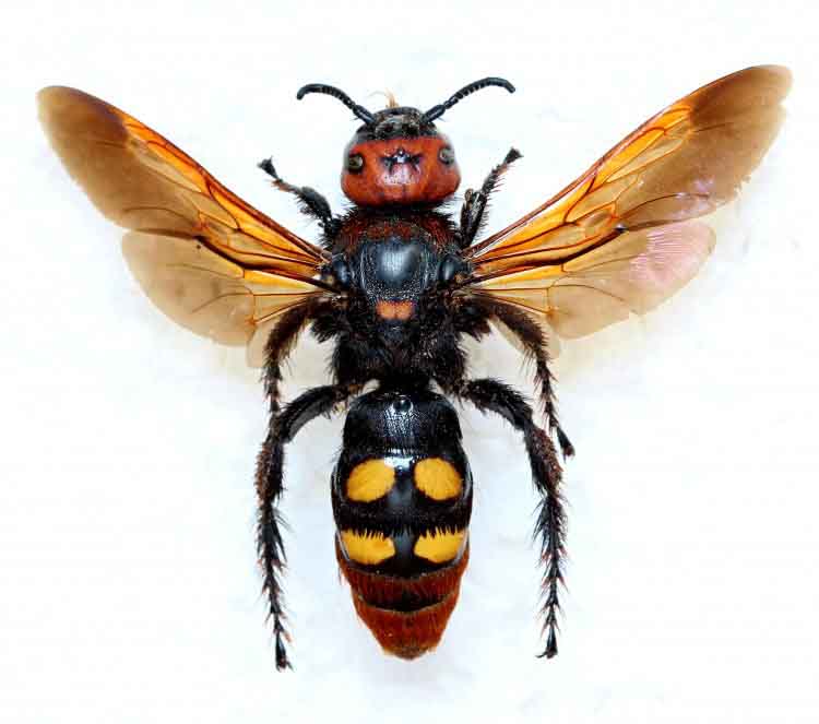 Для справки: сколия пятнистая, или сколия-гигант Megascolia maculata (Drury, 1773), — самая крупная оса (до 4 см длиной) из семейства Scoliidae (рис. 3), грозная на вид и громко жужжащая в полёте, но вовсе не агрессивная. Обычно не использует жало как орудие защиты, и её даже безопасно держать в руках, не опасаясь укуса. Проверено лично, подтверждается.