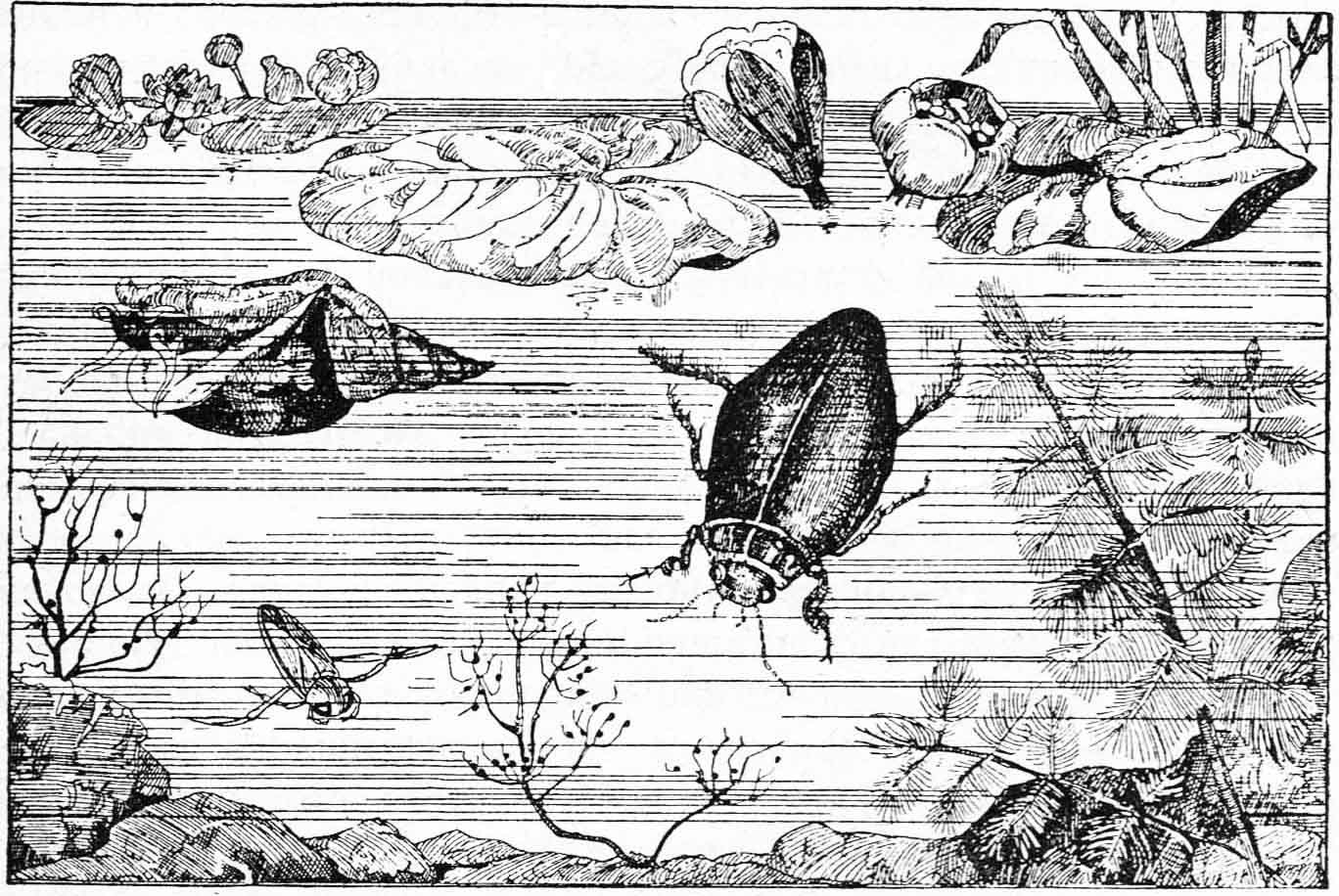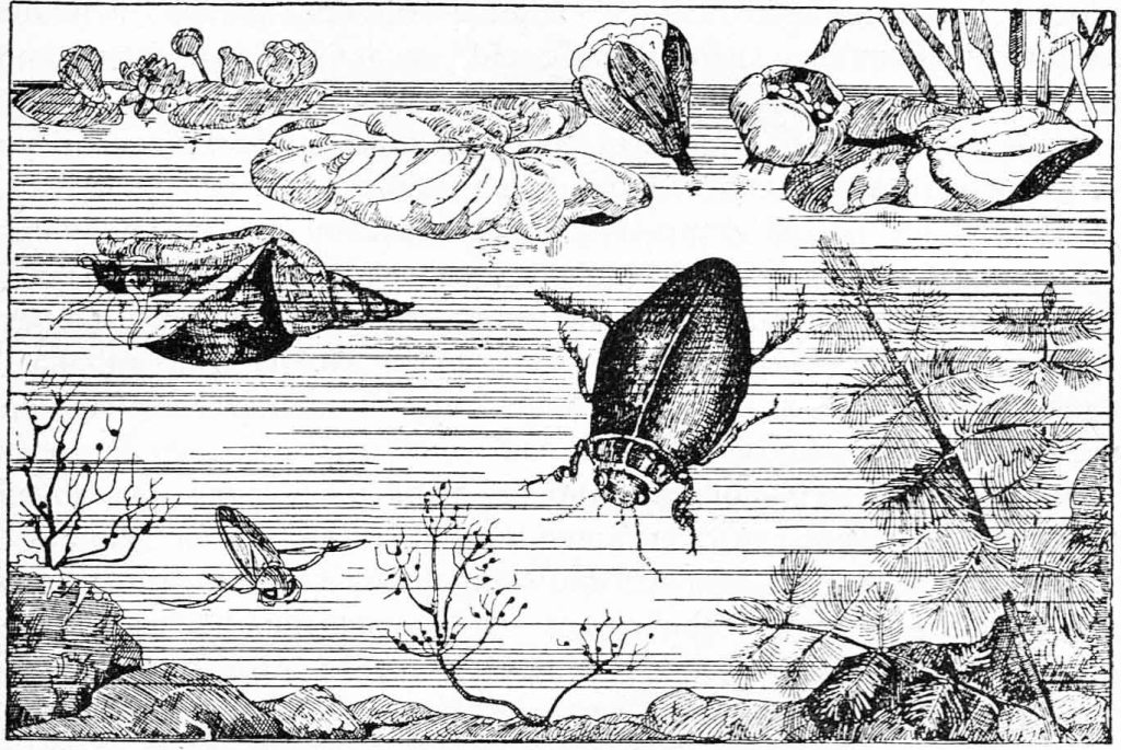 Естествоиспытателям и рыбоводам давно известно, что многие насекомые — в стадии личинок, а то и на более высоких ступенях развития — пожирают молодых и слабосильных рыбок. Таковы жуки-водолюбы (рис. 1), плавунцы (рис. 2) и скакуны (рис. 1), а также личинки некоторых видов стрекоз и коромысел2, с ожесточением охотящихся на мальков и рыбью молодь.
