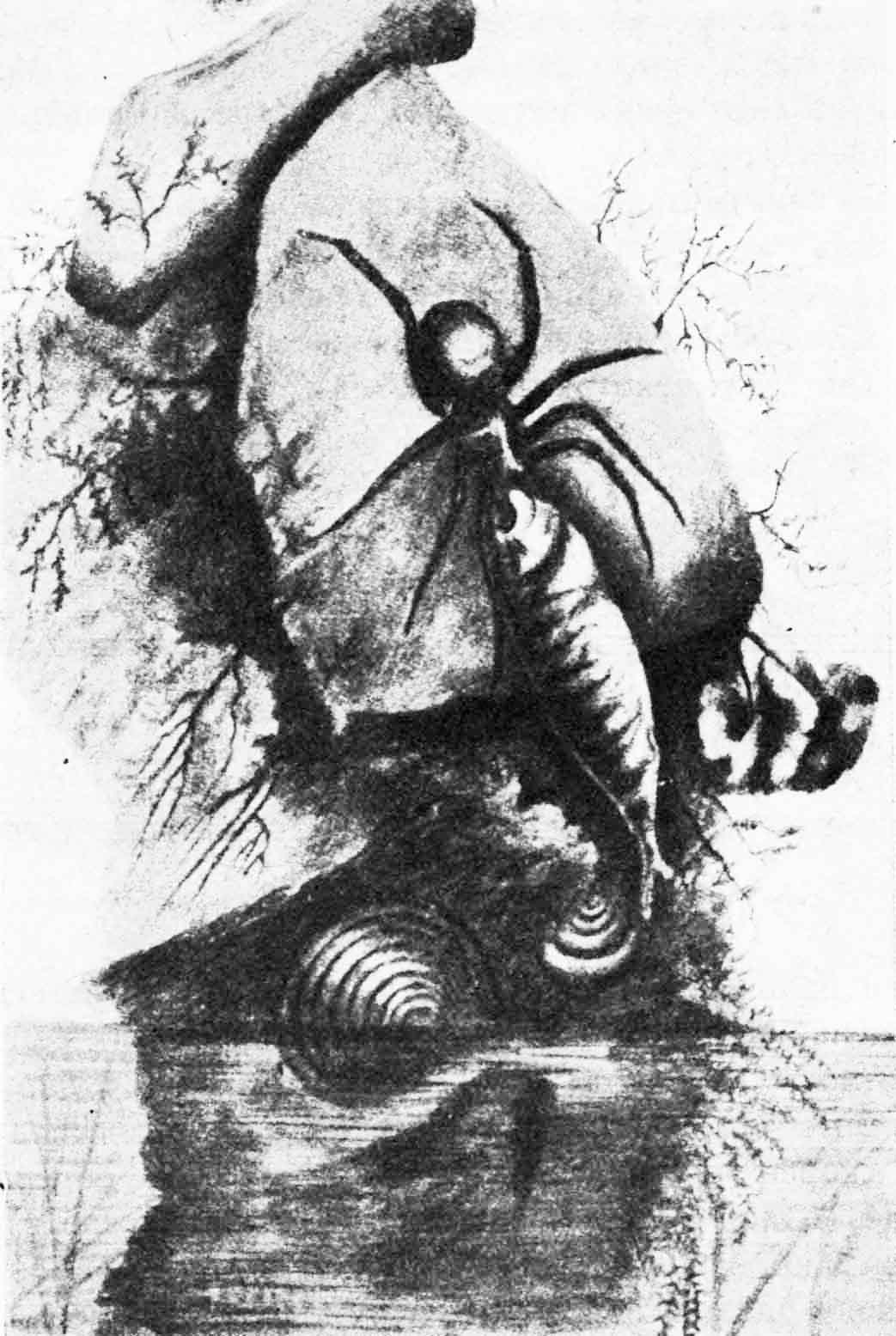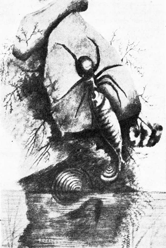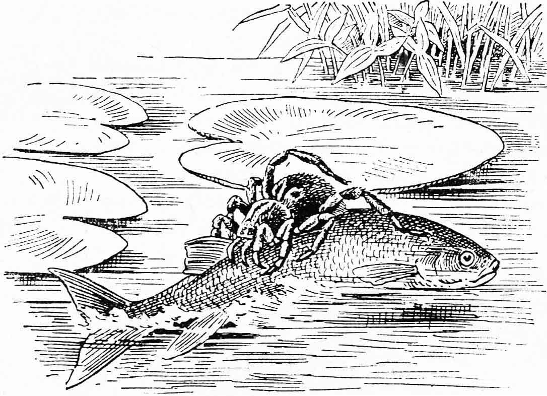 Первое известие о таком странном явлении, как охота пауков на рыб, помечено 1859 годом и получено через проф. Спринга, гостившего в Новом Южном Джерси у своего приятеля. Гуляя по дамбе одного болота, оба заметили посреди канавы большого чёрного паука, производившего несвойственные паукам телодвижения. Присмотревшись ближе, они убедились, что паук присосался к спине рыбы и вцепился в неё когтями (рис. 4). Рыба порывисто плавала и неистово била хвостом, явно стремясь отделаться от седока. Раза два она нырнула так, что над водой оставалась голова паука. Рыба явно выбивалась из сил, слабо отбиваясь плавниками; не удалась и попытка утопить паука, забравшись вместе с ним под большой лист кувшинки. Тогда паук решил, что пора кончать; дотащил рыбку вплавь до откоса канавки и стал выталкивать её на берег. Прошло 6—8 минут, а паук все ещё возился со своей добычей.