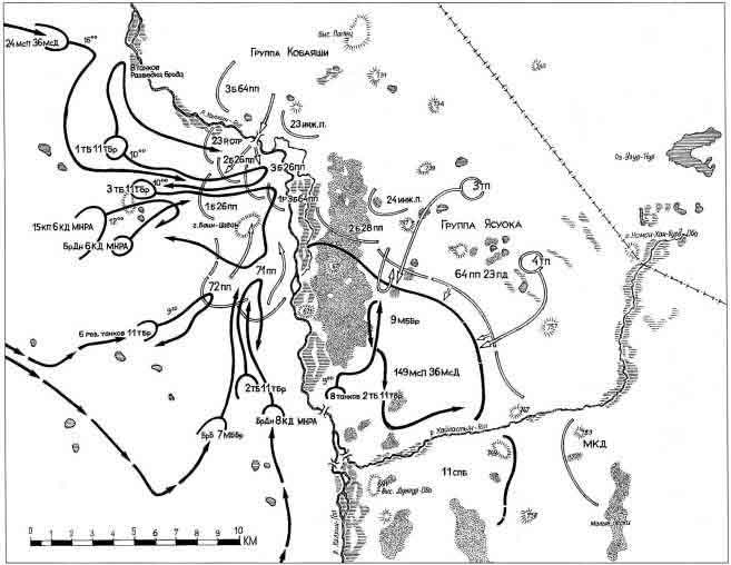Отбив июльский натиск японцев, Жуков стал готовить масштабное наступление. Он разделил войска на три группы. Центральная должна была сковать боями основные силы врага, лишив их маневра. Северной и Южной поручалось ударами на флангах по сходящимся направлениям замкнуть кольцо окружения. Наступление было намечено на 20 августа.