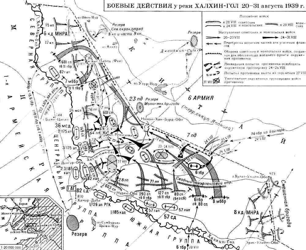 20 августа в 6:15 утра 153 бомбардировщика нанесли удары по японским позициям. Началась артподготовка из 200 орудий. Затем последовал второй воздушный налет, и в 9 часов утра советские танковые бригады вспороли оборону противника. Японские войска в первый момент растерялись, но вскоре пришли в себя и стали оказывать яростное сопротивление. Жукову пришлось вводить в бой резервы: сначала 9-ю мотоброневую бригаду, затем — 212-ю авиадесантную, а 23 августа на участке Центральной группы в бой пошли две роты пограничников. Больше никаких войск в его распоряжении не было… К счастью, они и не понадобились. 26 августа Северная и Южная группы соединились у монгольской границы, замкнув кольцо вокруг 6-й армии. Началось ее дробление рассекающими ударами и уничтожение по частям. К утру 31 августа территория МНР была очищена от вражеских войск.