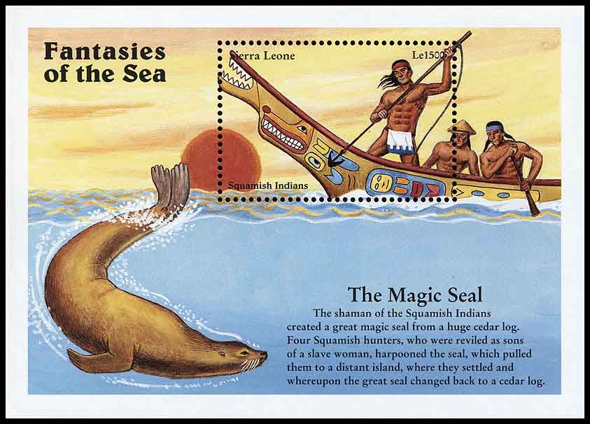 Шаман индейцев сквомиш создал великого волшебного тюленя из огромного бревна кедра. Четыре охотника, которых поносили как сыновей рабыни, загарпунили тюленя, утянувшего их на далёкий остров, где они поселились, после чего великий тюлень превратился в бревно кедра».