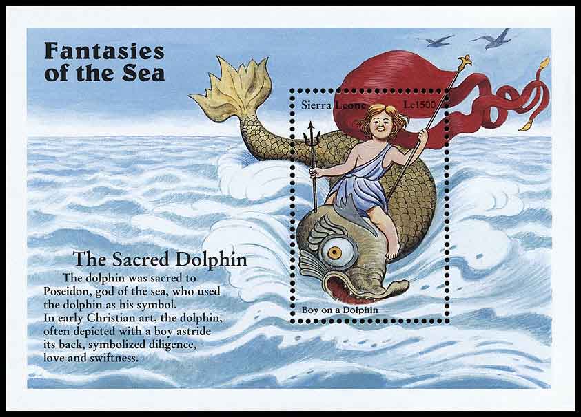 Дельфин был посвящён Посейдону, богу моря, который использовал дельфина как свой символ. В раннем христианском искусстве дельфин, часто изображаемый с мальчиком верхом на его спине, символизировал усердие, любовь и стремительность».